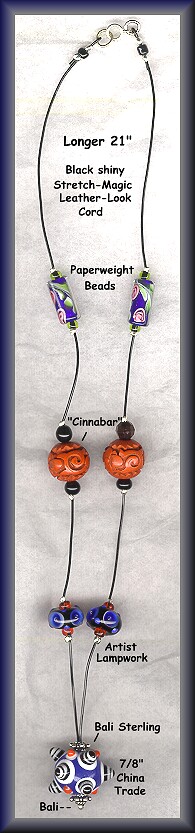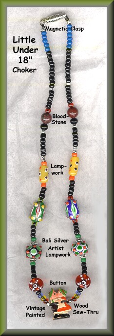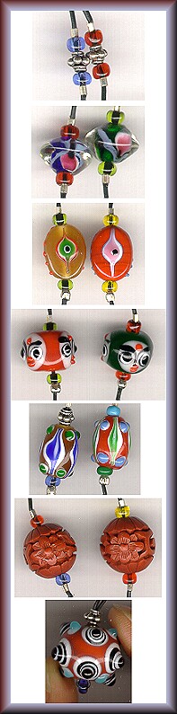 Here are some lampwork bead and button (no harm done) jewelry I make with beads from all over the world including studio artist lampwork, seed beads, Bali sterling, sterling crimps and closures. Cording is 1mm faux-leather, some look like patent leather with a bit of stretch. Chokers, longer necklaces, a bracelet and earrings are shown below. See "Links" for some interesting button necklaces and pendants. A bracelet and some of the necklaces have magnetic clasps which can be handy to have with you at button shows to test metal buttons for steel content. I also have Magnet Charms on Page 2 linked below if you just want a magnet to carry with you. |