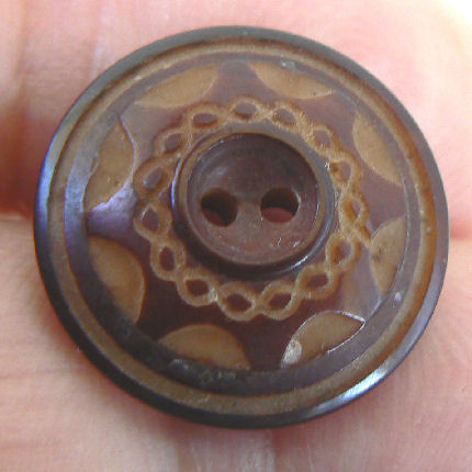 Avail. ![]() (Vi-20) Brown/tan mottled with art-deco pressed fine lined arcs surface vintage vegetable ivory button. Medium 7/8" (22mm). 12pcs. avail. $2.00ea. |