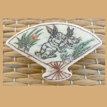 ![]() Two Bunny Rabbits, scrimshaw etched, fan shape bone button. Lg. approx. 1-1/2" |