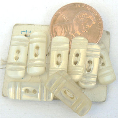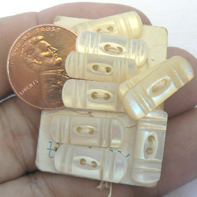 ![]() (Asst-9) Shimmering oblong carved vintage creamy white ocean pearl shell button. Small 5/8" x 1/4". Closer view click here. 9pcs avail. sold individually for $1.50ea. |