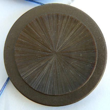 ![]() (LgPlast-19) Med. brown fabric-look rayed detail vintage plastic coat button.. Large, little over 1-1/4" (34mm). Closer view click here. ONE pc. avail. $5.00 |