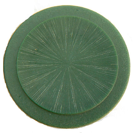 ![]() (LgPlast-18) Med. green fabric-look rayed detail vintage plastic coat button. Large, little over 1-1/4" (34mm). Closer view click here. TWO pcs. available. $5.00ea. |