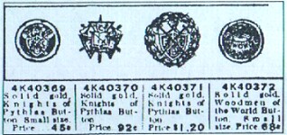 By 1900 there were over 300 fraternal orders with a membership of 5 million. Many societies had separate clubs for women and children of the male members such as the International Association of Rebeckah (Oddfellows), Royal Neighbors (Woodmen of America). Ornamentation included buttons, watch fobs, pins, badges and swords. Lilley and Pettibone manufactured all these items. The 1917 Sears Catalog featured a full page of Fraternal Society and Club buttons (see illustration below). The Sears Catalog was mainstream America at this time and illustrates the enormous popularity of these societies.