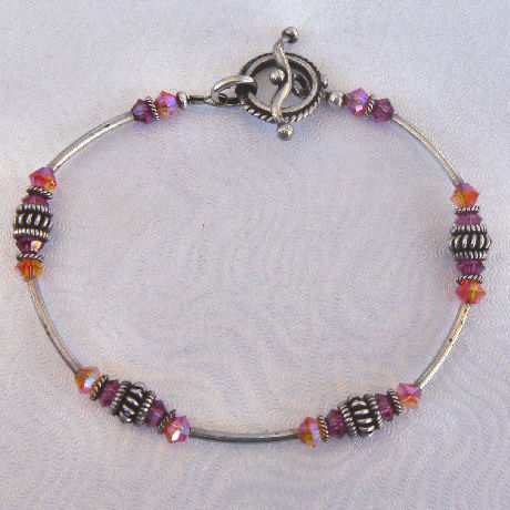 ![]() (VJ-13) Swarovski crystal studded, Bali silver findings, curved long liquid silver beads, toggle clasp artisan created bracelet. 2x aurora Swarovski beads make this one really sparkle. 7.5". A few tiny spots of tarnish here and there, nothing glaring. Another image click here. $14.00 |