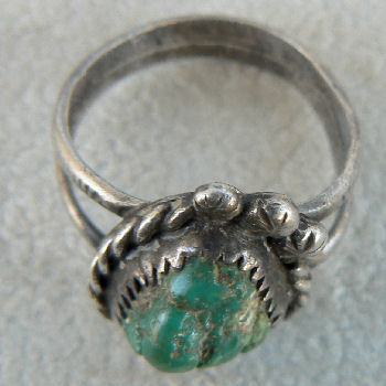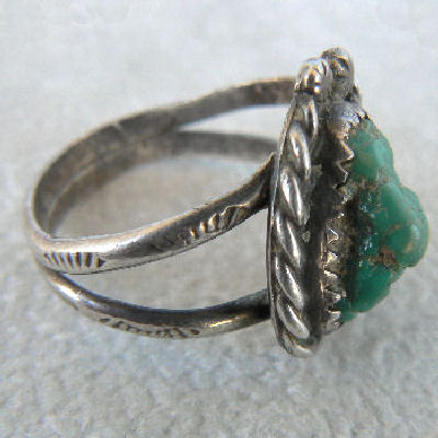 ![]() (VJ-9) Dainty roped border turquoise nugget marked 925 vintage Southwestern sterling ring. Center oval is 3/8". Border has a little spur you may wish to clip or file down a bit, seems as-made. Delicately split shank either side of setting. Size 7.5. Another image click: here. $21.00 |