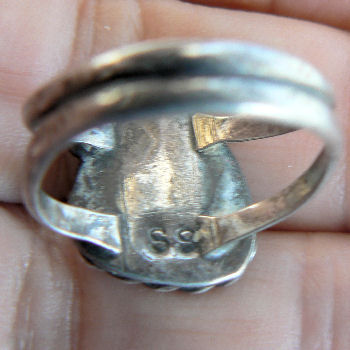 ![]() (VJ-7) Make a statement with this 1-1/8" long oval repousse bubbles coral stone triple split shank vintage Southwestern ring. Size 8.25. I believe this is silver. Mouse over or click above image for side view. Small as-made casting flaw on the side, not glaring. More images click here; here. $39.00 |